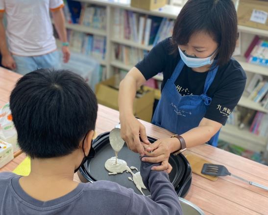 在製作鬆餅的過程中,除了老師和九州鬆餅的夥伴們一起陪同幼兒園的小朋友外,也可以看到同學們之間互相溫柔地提醒,「注意燙」、「小心灑出來」、「袖子會沾到麵糊」等暖心的詞句。