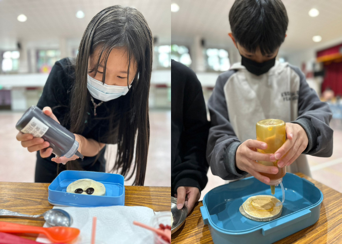 由於活動舉行在平安夜前夕,我們希望能讓小朋友感受到不同的聖誕節氛圍,因此特別準備了充滿聖誕節感覺的糖果作為鬆餅的點綴,同學們在鬆餅煎製完成後,可以透過醬料、水果與糖果裝飾屬於自己的各製化聖誕節鬆餅。