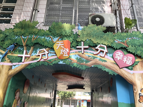 十分國小裡充滿了美麗的天燈裝飾,小朋友們在這個美麗的校園吃著好吃的九州鬆餅,真開心