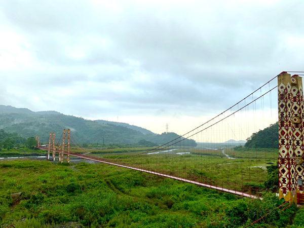 鬆餅車在充滿詩意的小雨中前行,蜿蜒小路上沿途有著磁磚拼貼的原住民的圖騰在道路兩旁,接近目的地寒溪國小時,映入眼簾的是橫跨位在番社坑溪上游全長324公尺的寒溪吊橋相當壯觀。