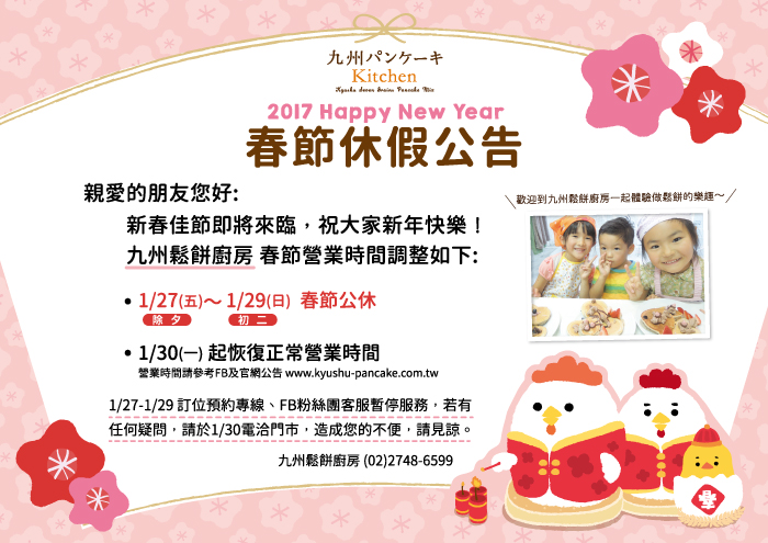 九州鬆餅廚房新春期間營業時間公告2017-01-06