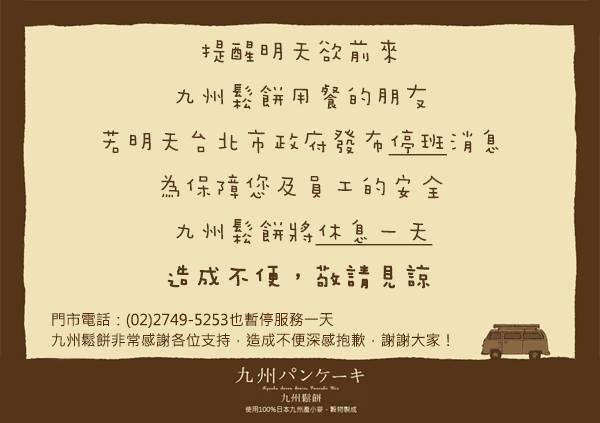 【昌鴻颱風】若明天(7/10)台北市政府發布停班消息,為保障您及員工的安全,九州鬆餅將休息一天。2015-07-09 大家好,提醒明天欲前來九州鬆餅用餐的朋友,若明天台北市政府發布停班消息,為保障您及員工的安全,九州鬆餅將休息一天唷。