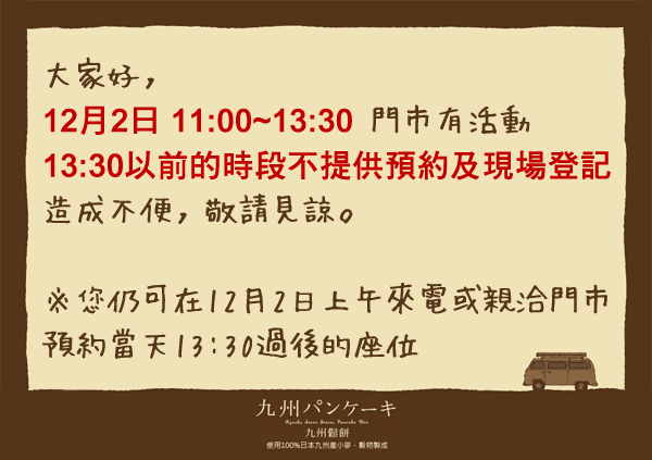12月2日11:00~13:30門市有活動,13:30以前的時段不提供預約及現場登記,造成不便,敬請見諒。2015-11-27 大家好, 12月2日 11:00~13:30門市有活動 13:30以前的時段不提供預約及現場登記 造成不便,敬請見諒。 ※您仍可在12月2日上午來電或親洽門市預約當天13:30過後的座位